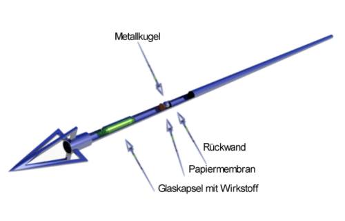 Ganz einfach: Beim Aufschlag durchschlägt die Metallkugel aufgrund der Massenträgheit die Membrane, zerstört die Glaskapsel mit dem Wirkstoff und treibt diesen in den Körper des Opfers.